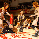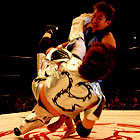 広田のコスプレはこの日、PRIDEに出場した桜庭和志。ヒザの肌色サポーターにはDSEのチェックを入れるなど、芸が細かい。リングに上がるや、開口一番「すいません、会場間違えました…」と笑顔で語った桜庭さくらは、サソリに「お前、それでもPRIDE戦士か!お前もシューズを脱げ!」と、唐突に素足になることを要求。するとサソリもなぜか素直にシューズを脱ぎ、更に靴下のワンポイントを広田に突っ込まれ、照れ笑い。