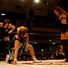 反撃に転じた飛鳥は、尾崎、輝、植松をまとめて寝かせて机フット。更にボム系連打で尾崎を追い込むが、終盤、またも更利位万が乱入し、狂ったようにバッグファイアーの乱れ打ち。