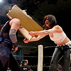The second match of double main event: This was to be the final and perfect conclusion match between Aska & KAORU who were both knocked out as the result of strong mortal combat. They fought by hardcore rule. KAORU appeared holding a black ladder and Asuka appeared with gold and silver desks. While the battle was fought in alternate defense and offence using a ladder, KAORU showed moon salt and Aska showed suplex from the top of ladder. Aska made KAORU with the ladder down from the top of the ladder out of the ring and then the battlefield changed from the ring to outside of the ring.
