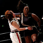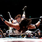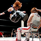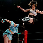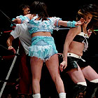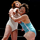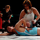 But the tide turned on Jaguar by her lariat. She tried to get Mizumura over by All Japan Women Pro wrestling style. Mizumura waded through to put her shoulder up and then she revenged Jaguar from body slam to push Jaguar by All Japan Women Pro Wrestling style. The crowd was excited by her display of guts. But in the mean time, Jaguar pushed her again and she got a count of three. The oldest wrestler in the female pro wrestling industry Jaguar, against the 17 year old with a 6-month career Mizumura, resulted in a very good and interesting match showing their difference in careers.