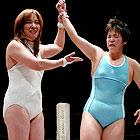 THE SECOND MATCH: Hirota appeared in the ring with Hokuto's costume. But when she took the robe off, underneath she was wearing Mita's costume. Nagayo took Mita who came to see GAEA show, to the ringside and made her a fake corner man. When the gong rang, Hirota imitated Mita's husky voice and she constructed the match by only using this. Shimoda was difficult to catch her pace in this match. Around the end of the match, Hirota tried to use her favorite finishing move, but failed. At last Shimoda threw Hirota and got a pin over Hirota by suplex.