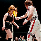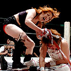 THE THIRD MATCH: Ozaki, Hamada and Amazing Kong appeared with the D-Fix theme music. From the first, Hamada and Amazing Kong got in the ring with Ozaki, Police and KAORU who was holding crutches made by barbed wire. So a big shout went up in the venue. Heel wrestlers lead this match and they caught GAMI but AKINO of baby face wrestlers struggled in the match and changed the bad movement. Then Kansai blew up. She kicked Ozaki off and she fought with Amazing Kong evenly. She also got Amazing Kong who was on the corner post, and threw at her stirring. When Amazing Kong returned it, Kansai did foot stamp twice. Amazing Kong got over it and she did back hand blow to Kansai strongly. And Hamada got into by spin kick three times. But by that time GAMI had recovered. She did running megaphone to Ozaki with bloody face and jumped to Hamada liger bomb with both of them standing on the top rope. Almost all the audience supported GAMI. She was fighting to the finish from lariat to adios amigo but then Police broke into her. All the audience was booing him. At once Ozaki crushed a piece of desk that KAORU gave to her on GAMI's head and Hamada did AP cross and she won.