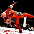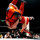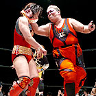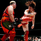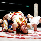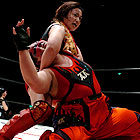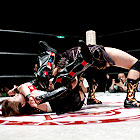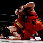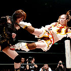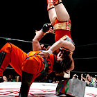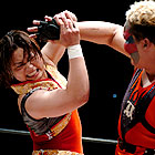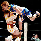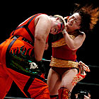THE SEMI FINAL: This was the second match for Satomura after her recovery. She fought conservatively as she recognized her condition. But Aja aimed at her loin and attacked Satomura mercilessly. Satomura , who was fighting against heavy odds, revenged by overhead. She bared the pain of her waist and took Aja up and did death valley. Aja returned that death valley and also tried to do death valley to Satomura as well, but she failed. Satomura revenged. They kept up this very hard fighting for a while. While they were staggering, Aja tried to hit a backhand blow but Satomura returned. So Aja did diving elbow from the top of corner to Satomura. Although she attacked Satomura, she took Aja's hand and tied it up. Aja found it difficult to escape it but finally she started to change the position of her body little by little and did stretch muffler to Satomura's waist. Fortunately Satomura escaped, but they were almost down by this hard fighting.