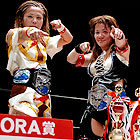 THE FOURTH MATCH: Uematsu & RAN appeared with new costumes. Toyota was walking the leading road holding the champion belt. Around the beginning of the match, Toyota was leading. She kicked Uematsu and threw RAN. Uematsu & RAN tried to fight with Toyota & Amano out of the ring. Toyota & Amano refused to fight with them out of the ring once but they were dropped again. And then the battlefield changed from in the ring to out of the ring. With the progress of the count, this match became confusing. At last, there was just a single combat fight between Amano and RAN. Dazing fighting continued for a while. The fighting was very hard. Finally, RAN did running elbow to Amano and then RAN won. Uematsu & RAN became the last AAAW tag champion.